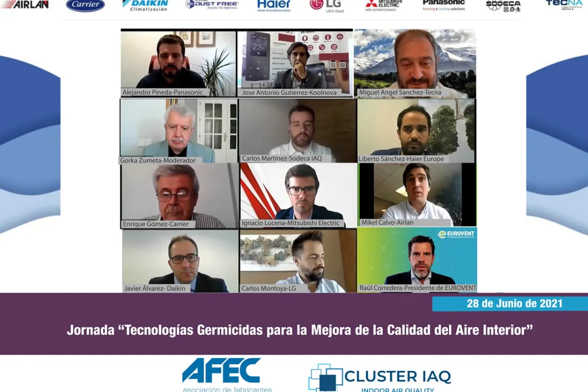 La grabación de la sesión está disponible próximamente en la página web http://tecnologiasgermicidas.org/volver-a-ver/ y en los canales de YouTube de AFEC y del Cluster IAQ.