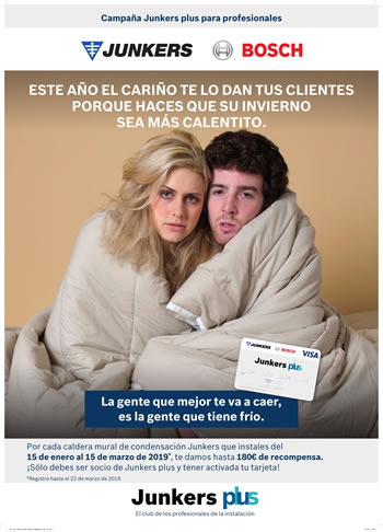Así, mediante la campaña “La gente que mejor te va a caer, es la gente que tiene frío”, vigente desde el 15 de enero al 15 de marzo de 2019, los profesionales inscritos en el Club Junkers plus podrán recibir recargas de hasta 180 euros por la instalación de una Cerapur, CerapurComfort o Cerapur ExcellenceCompact. Esta gama de calderas murales de condensación permite a Junkers ofrecer las mejores soluciones en calefacción y agua caliente, adaptándose a las necesidades de cada vivienda y cada cliente.