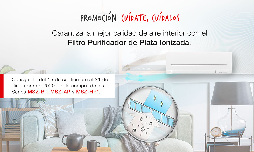 Mitsubishi Electri quiere garantizar la calidad de aire interior y, por tanto, para cuidar de tu salud y la de los tuyos es lo más importante, especialmente ahora que llega el invierno y aumenta el tiempo que pasamos en casa, ha decidido lanzar su nueva campaña promocional en la que por la compra de cualquier modelo de la serie MSZ-BT, MSZ-AP o MSZ-HR hasta el 31 de diciembre, se enviará sin coste adicional un filtro purificador de plata Ionizada MAC – 2370FT-E.